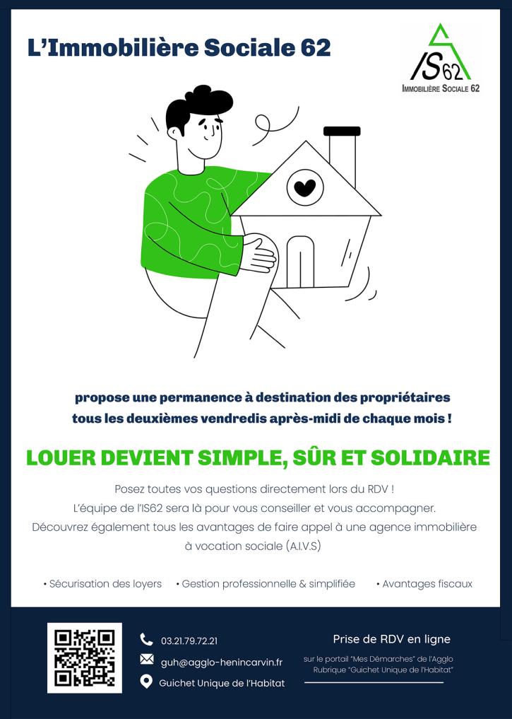 L’IS 62 est une agence immobilière à vocation sociale qui gère des logements locatifs privés à destination de ménages aux faibles revenus. La prospectrice de l’IS 62 se tient à la disposition des propriétaires bailleurs lors d’une permanence mensuelle (sur rendez-vous) au siège de l'Agglo Hénin-Carvin, 242 boulevard Schweitzer à Hénin-Beaumont, pour expliquer le fonctionnement et les avantages de confier la gestion des biens immobiliers à leur agence.