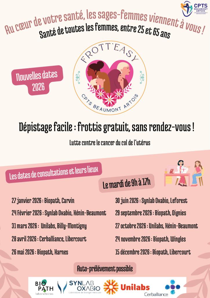 L’action Frott’easy est une initiative de la CPTS Beaumont Artois, en collaboration avec les laboratoires du territoire, visant à promouvoir le dépistage du cancer du col de l’utérus. Cette campagne propose des demi-journées de dépistage gratuites et sans rendez-vous, organisées un mardi par mois. Les prélèvements sont effectués par des sages-femmes de la CPTS, offrant ainsi un accès facilité au dépistage pour les femmes de la région.