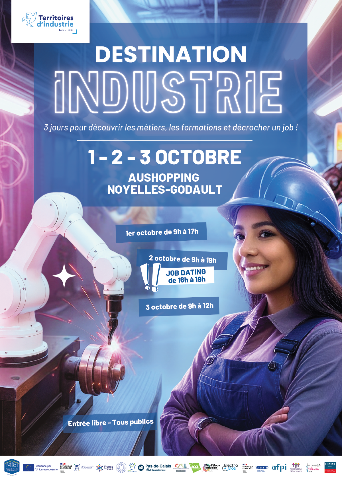 Durant 3 jours, Territoires d'industrie Lens-Hénin vous invite à découvrir les métiers et les formations dans l'industrie dans votre centre Aushopping Noyelles-Godault. Vous pourrez également tenter de décrocher un job durant le job dating le jeudi 2 octobre de 16h à 19h.