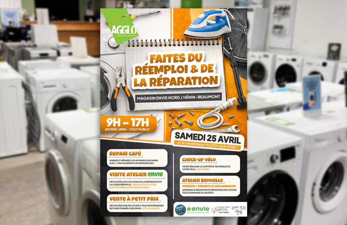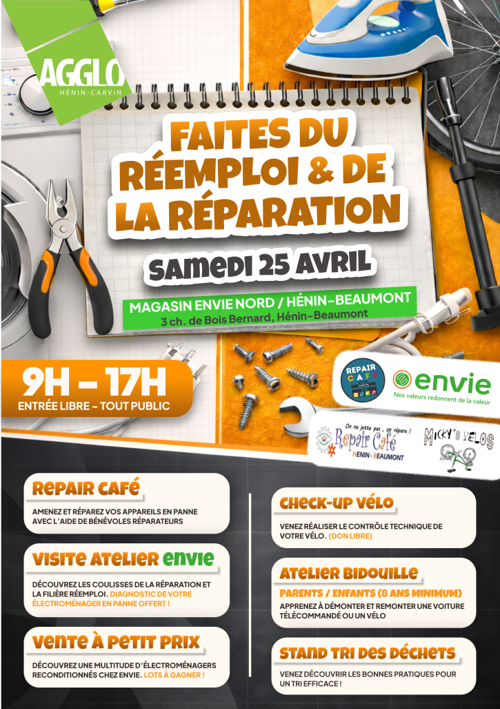 L’Agglo Hénin-Carvin lance la première édition de "Faites du réemploi et de la réparation" le samedi 25 avril de 9h à 17h, un événement gratuit et tout public au magasin Envie à Hénin-Beaumont. Entre ateliers pratiques, repairs cafés et découverte des coulisses du reconditionnement, petits et grands pourront apprendre à donner une seconde vie à leurs objets.