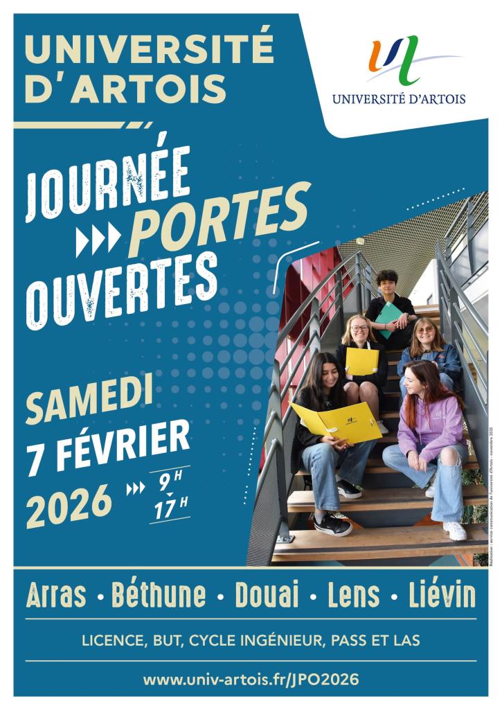 La Journée Portes Ouvertes à l'université d'Artois se déroulera le samedi 7 février 2026 de 9h à 17h sur l'ensemble des pôles de l'université : Arras, Béthune, Douai, Lens, Liévin.