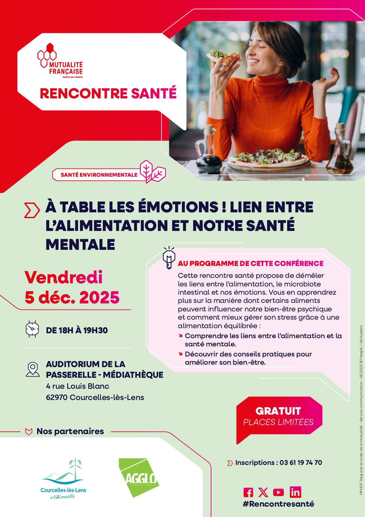 L’Agglo Hénin-Carvin en partenariat avec la Mutualité Française et la ville de Courcelles-lès-Lens organise un atelier participatif sur le thème : « À table les émotions ! Lien entre l’alimentation et notre santé mentale ».