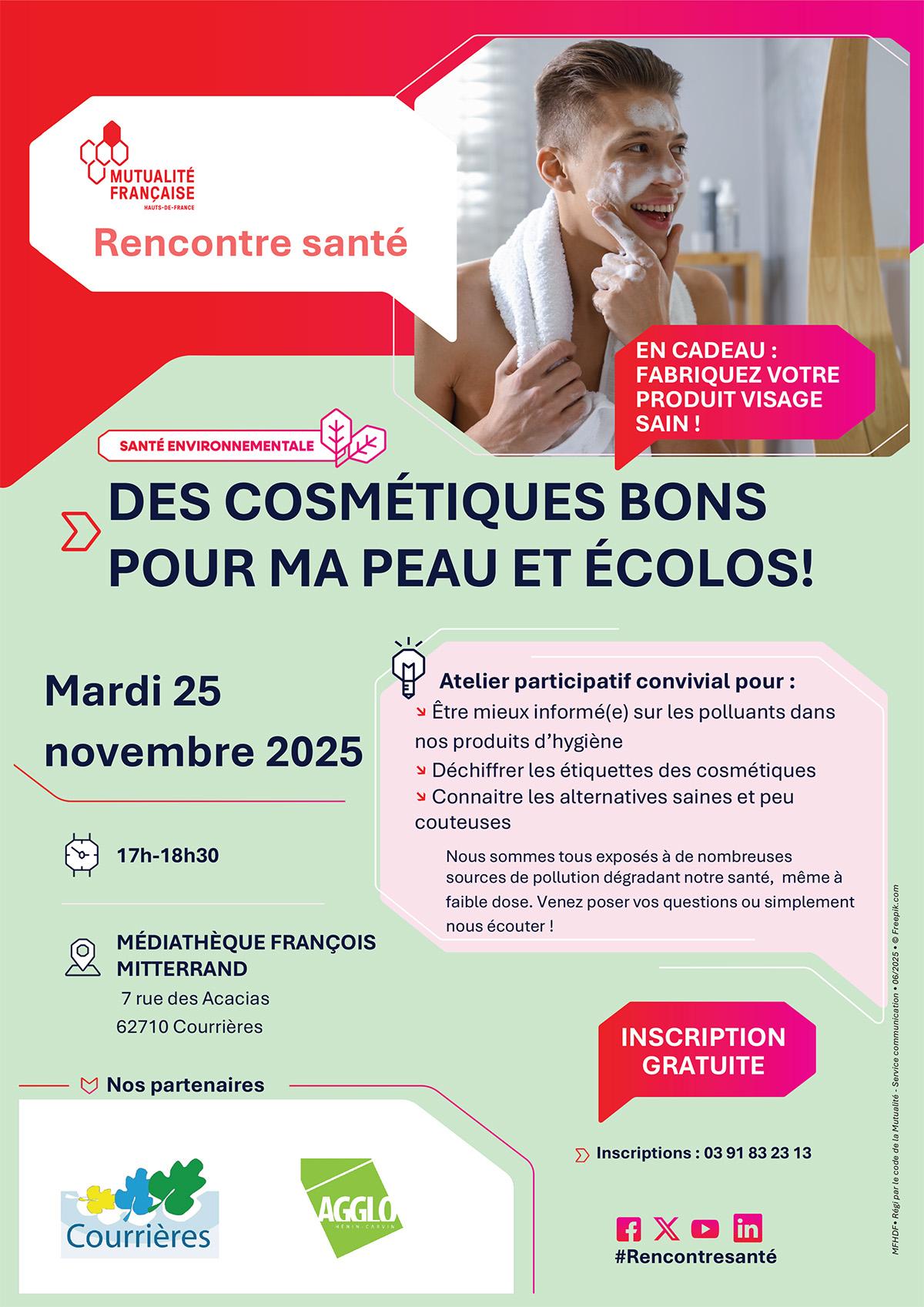 L’Agglo Hénin-Carvin en partenariat avec la Mutualité Française et la ville de Courrières organise un atelier participatif sur le thème : « Des cosmétiques bons pour ma peau et écolos ! ».